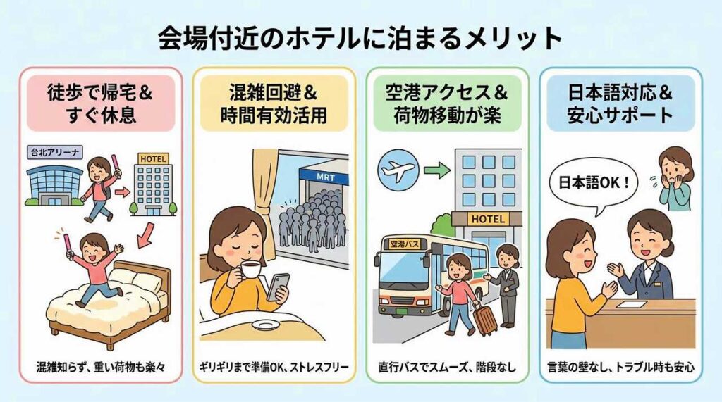 台北アリーナ周辺に宿泊することで、ライブ当日のスケジュールに大きな余裕が生まれます。