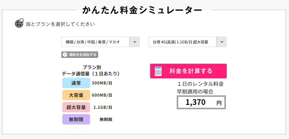 グローバルWiFiの場合(かんたん料金シュミレーター)、早期にレンタル契約した場合の1日のレンタル料金は1,370円となっていました。(早期適用料金が変わる場合もあります)
